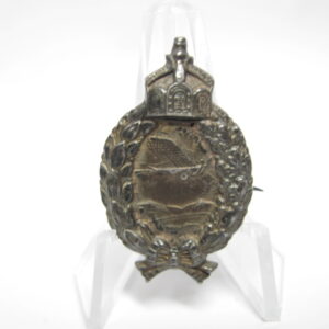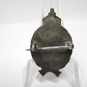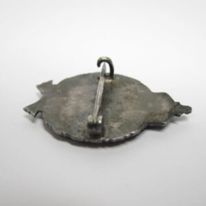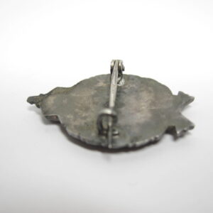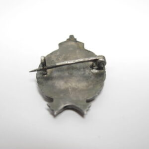 aus 800er Silber. Hohl verbödet, ohne Hersteller, die Krone nicht durchbrochen, die Bänderung unten nicht ausgesägt, mit aufgelötetem Nadelbock und mit rundem Nadelhaken, an runder Quernadel aus Silber.