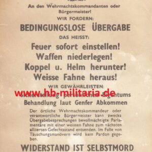 „An den Wehrmachtskommandanten oder Bürgermeister. Wir fordern: Bedingungslose Übergabe. Das heisst: Feuer sofort einstellen! Waffen niederlegen! Koppel u. Helm herunter! Weisse Fahne heraus! Wir gewährleisten: Sicherstellung persönlichen Eigentums, Behandlung laut Genfer Abkommen. Der örtliche Wehrmachtskommandeur oder verantwortliche Bürgermeister kann zwecks Übergabebesprechungen bevollmächtigte Parlamentäre mit einer weissen Fahne zum nächsten alliierten Gefechtsstand entsenden. Im Falle von Täuschungsmanövern wird kein Pardon gegeben. Widerstand ist Selbstmord. Der Befehlshaber der Alliierten Truppen“.