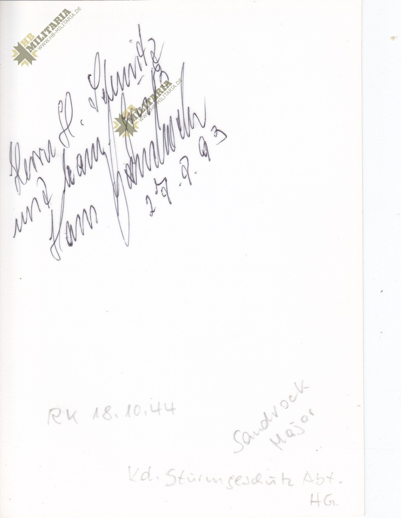 Foto von Major Hans Sandrock, Ritterkreuz am 18.10.44 als Major und Kommandeur in der III./FschPzRgt „Hermann Göring“, mit originaler Unterschrift, unten rechts und Widmung auf der Rückseite, Größe ca. 12 x 9,5 cm, guter Zustand. Das Foto selbst ist ein Repro, Unterschriften und Widmung sind original. Photo of Major Hans Sandrock, Knight’s Cross on 18.10.44 as Major and Commander in the III./FschPzRgt „Hermann Göring“, with original signature, lower right and dedication on the back, size approx. 12 x 9.5 cm, in good condition , The photo itself is a repro, signatures and dedication are original.