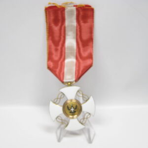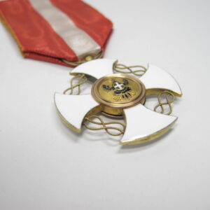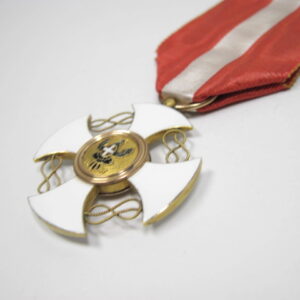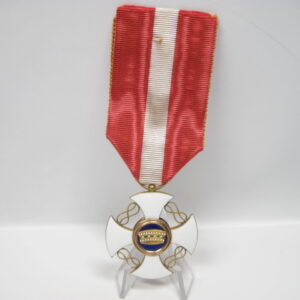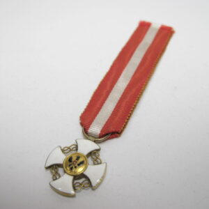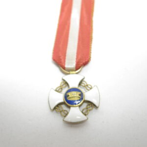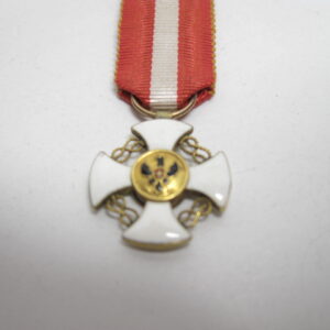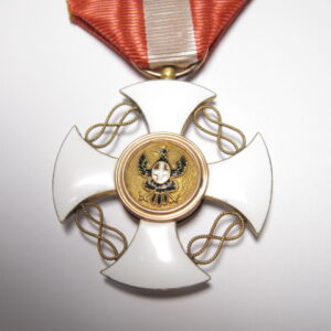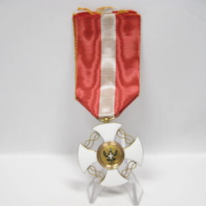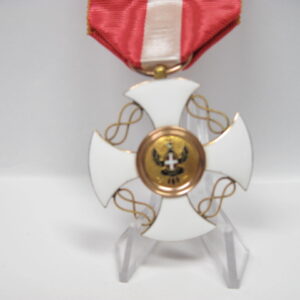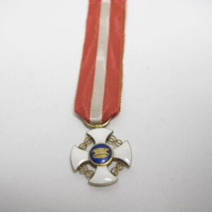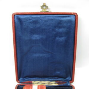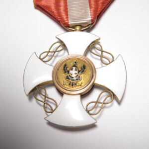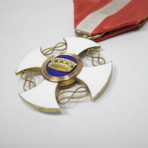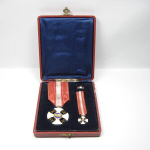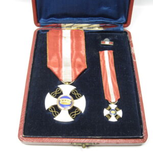 Gold, emailliert, mehrteilig durchbrochen gefertigt. Dazu Miniatur und Knopflochdekoartion, im roten Verleihungsetui,- dieses etwas bestossen. Blaues Innenfutter. Golden aufgeprägte Chiffre VE unter Krone. Zustand I – II.
