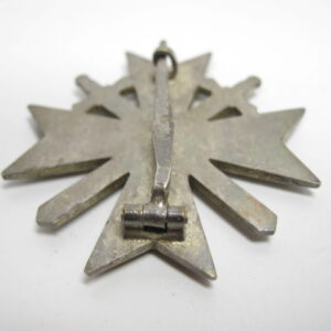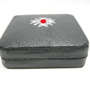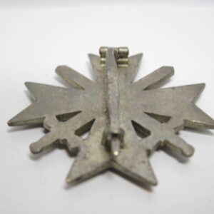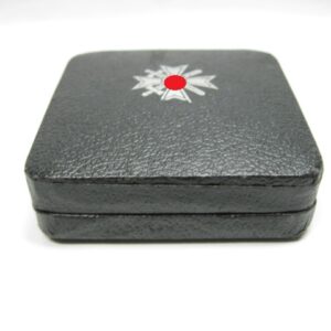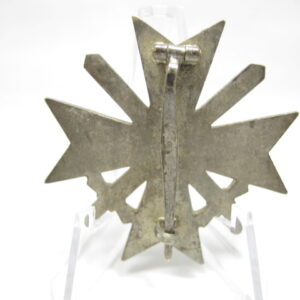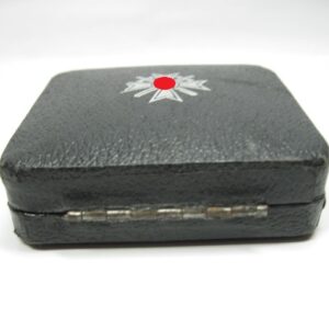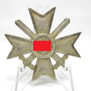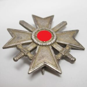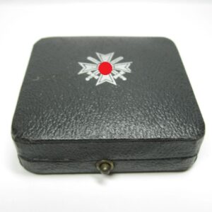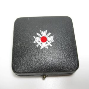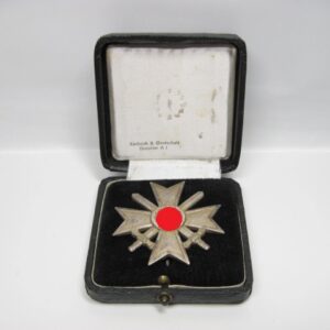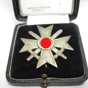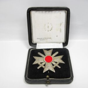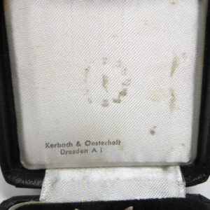 KVK 1.Klasse mit Schwertern im Verleihungsetui. Fertigung aus Buntmetall. Polierte Kanten. Rückseitig unter der Nadel mit Hersteller „62“ für die Firma Kerbach & Osterhelt, Dresden A1. Mit Verleihungsetui ebenfalls mit Hersteller Markierung „Kerbach & Osterhelt, Dresden A1“ Auf dem Deckel mit silberfarbenen KVK Aufdruck.