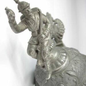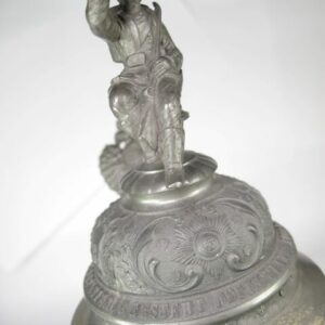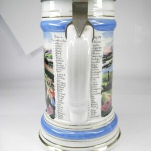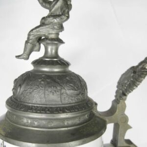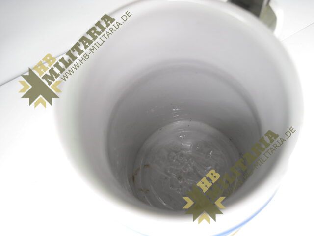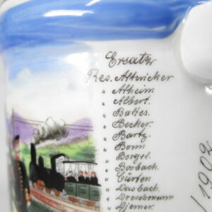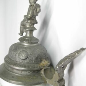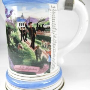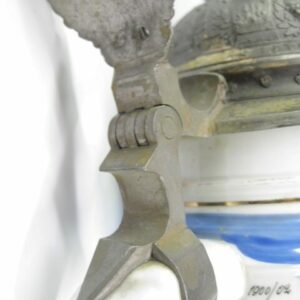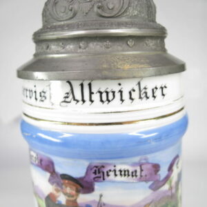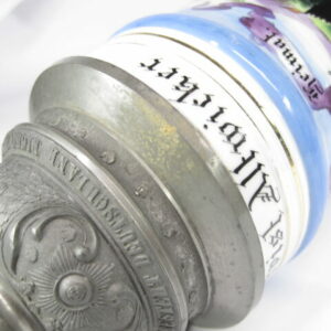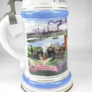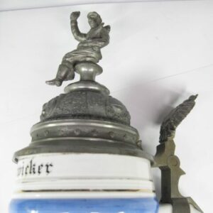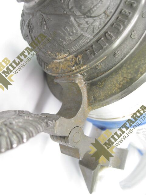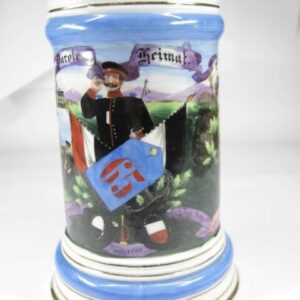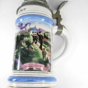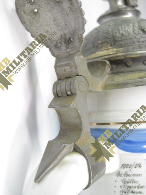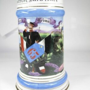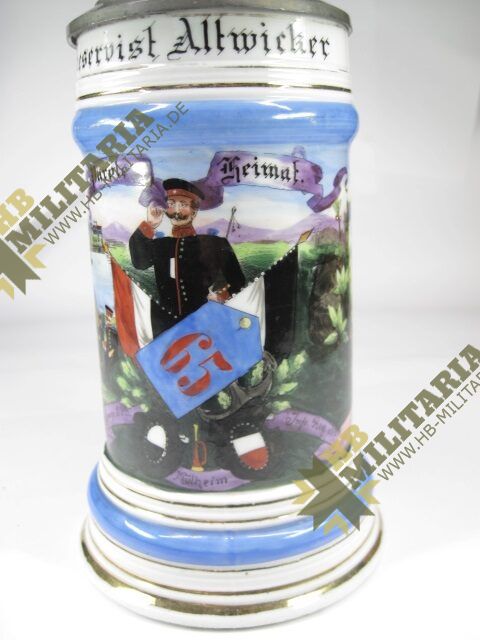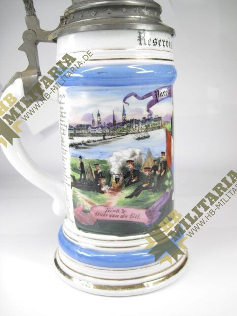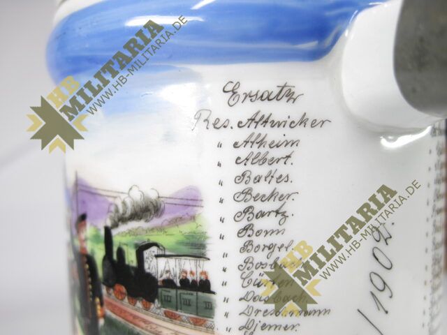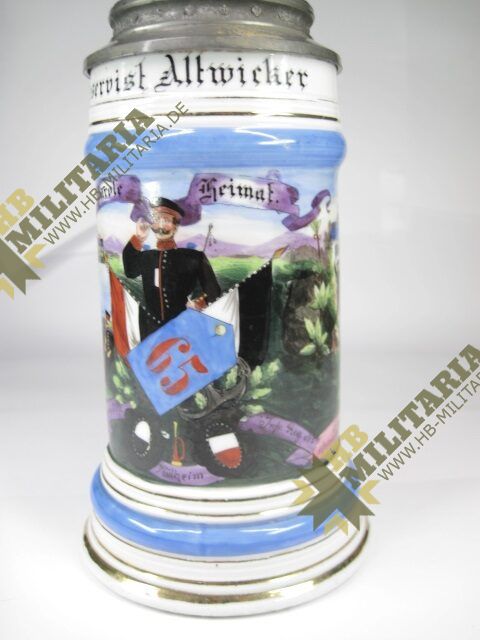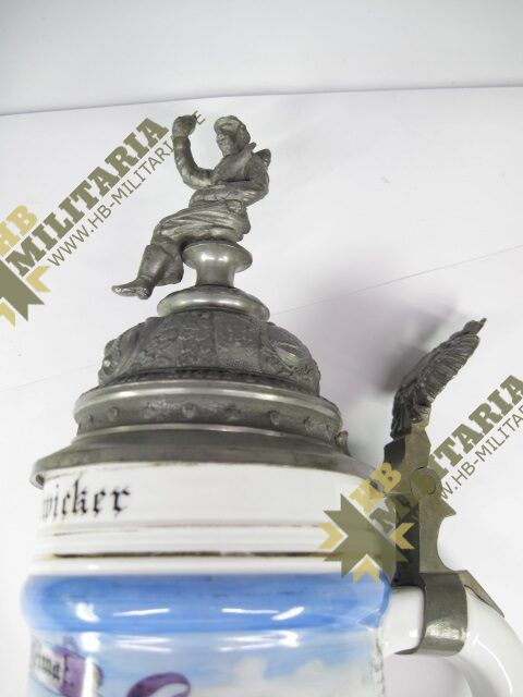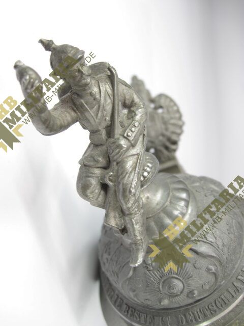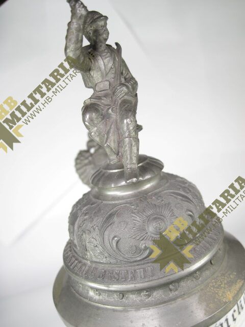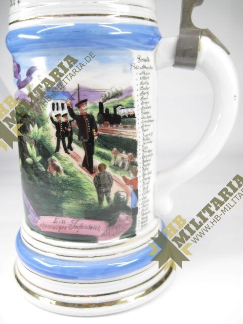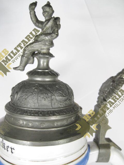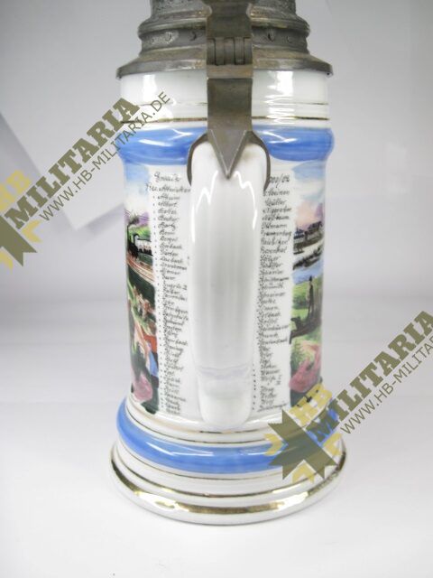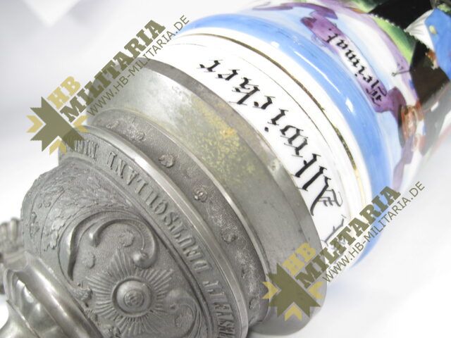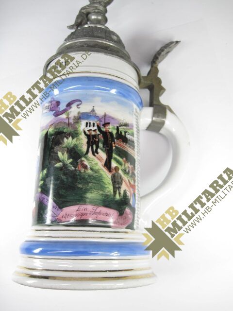 Porzellanausf., links- und rechtsseitig jeweils Soldatenszenen, 1 x Namensleiste auf der Rückseite, Füllmenge 0,5 Liter, versch. Durchscheinbilder, Zinndeckel mit Soldat als Abschluss, preußischer Adler als Daumendrücker, H bis ca. 29 cm, guter Zustand.