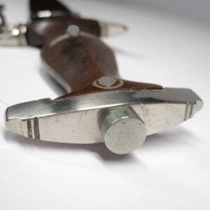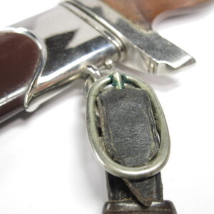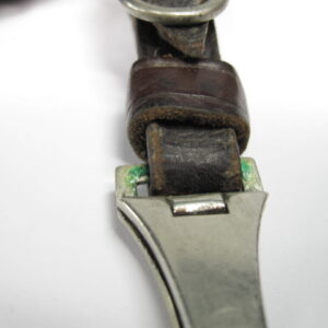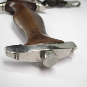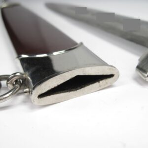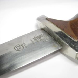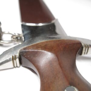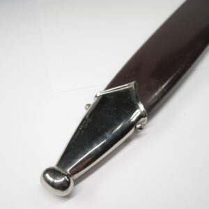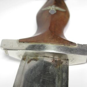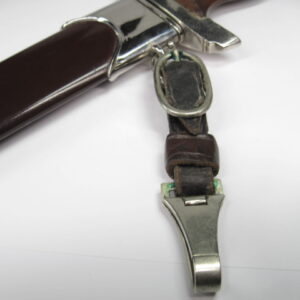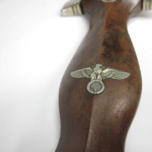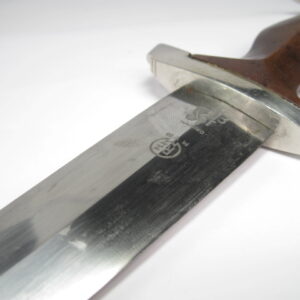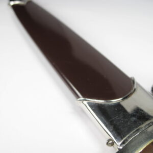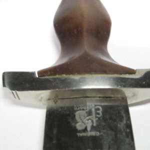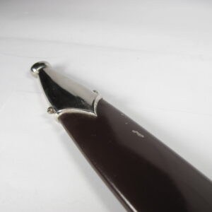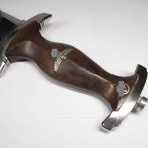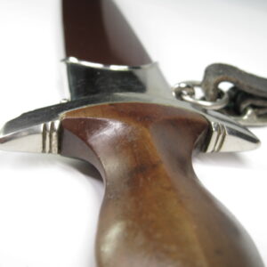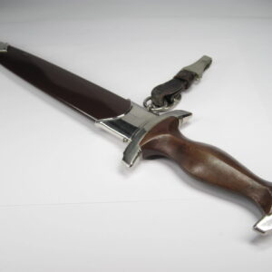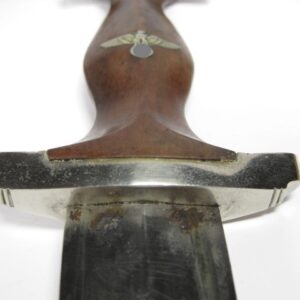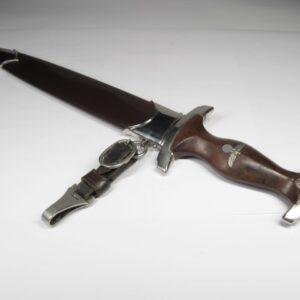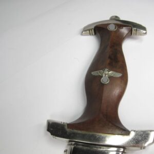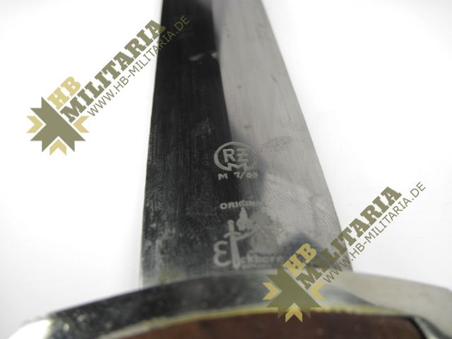 SA: Dienstdolch M33 – M7/66 – Eickhorn. Blanke Klinge mit bekannter Devise. Hersteller RZM M7/66 und Eickhorn, Solingen. Beschläge vernickelt. Hölzerner Griff mit eingelegtem originalen Adler und originaler Pastille, in lackierter Scheide mit vernickelten Beschlägen, mit Gehänge. Guter Zustand.