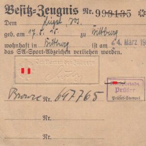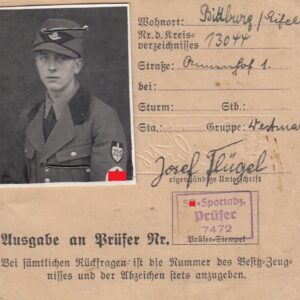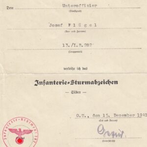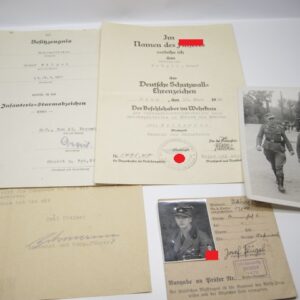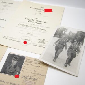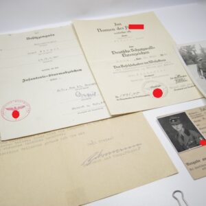 Dokumenten- Nachlass eines Unteroffiziers: XA Besitzzeugnis mit Foto für das Sportabzeichen in bronze. Infanterie- Sturmabzeichen, Schutzwallehrenzeichen. Kondolenzschreiben des Kompanieführers 1944, sowie Foto in Postkartengrösse. Gefaltet. Guter Zustand.