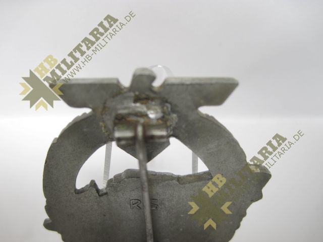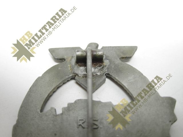 Schnellboot Kriegsabzeichen 2. Form. R.S. erhaben geprägt. Zink Stück. Sehr schweres, massives Stück mit Tragespuren. Späte Kriegsphase. Nadelbock wurde neu verlötet.