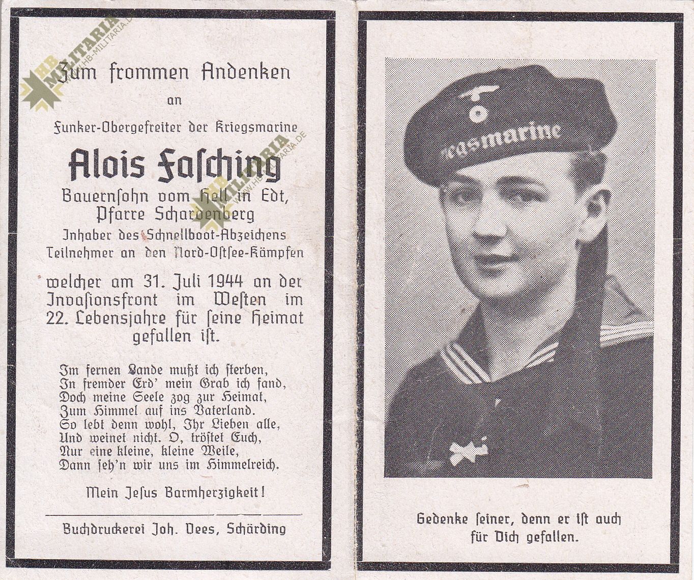Sterbebild Angehöriger der Kriegsmarine. Inhaber des Schnellboot Kriegsabzeichen`s. Teilnahme an Kämpfe in Nord und Ostsee. Gefallen 1944 an der Invasionsfront Normandie.