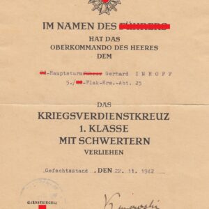 Urkunde für das Kriegsverdienstkreuz 1. Klasse mit Schwertern